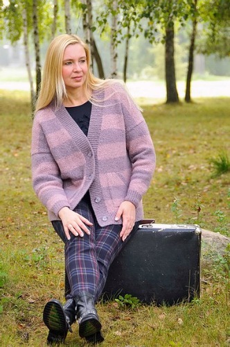Горизонтальные полоски здесь обузданы рамой более темного цвета, что не дает им растекаться и визуально прибавлять ширины. Главный акцент кардигана – широкая планка застежки – разбивает устоявшийся ритм, заявляя о намерении отправиться в даль.