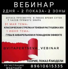 - 31 мая вебинар по классической стрелочке и теневой растушёвки век и 1 июня в по московскому времени состоится вебинар по зоне губ помадный и акварельный эффект