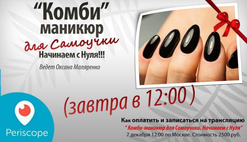 Закрытая трансляция от Оксаны Маляренко в перископ, в которой она расскажет и покажет, что нужно для начинающих мастеров, какие техники помогут начинающим сделать идеальный комби-маникюр.