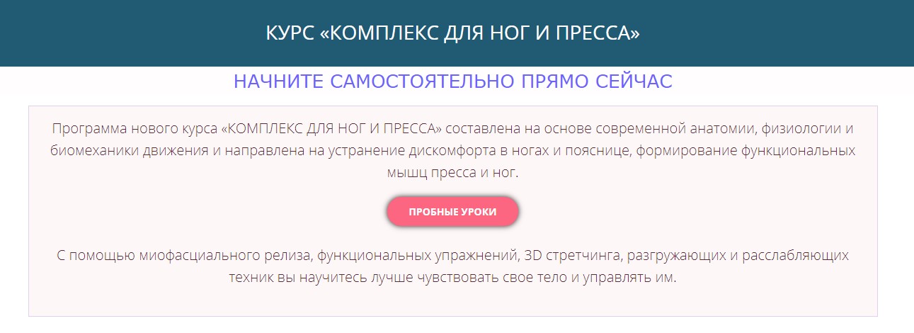Программа нового курса «Комплекс для ног и пресса» составлена на основе современной анатомии,физиологии и биомеханики движения и направлена на устранение дискомфорта в ногах и пояснице,формирование функциональных мышц пресса и ног.