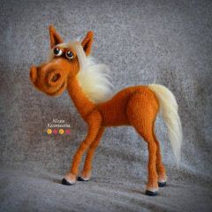 В высоту Арчи 27 см в длину 22 см. Ноги, шея и голова на проволочном каркасе. Копыта и глаза слеплены из полимерной глины. Тонирован сухими тенями и белой масляной краской.