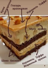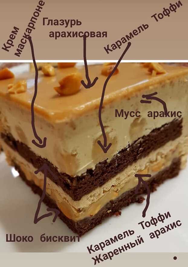 Шоко бисквит, тоффи с арахисом, креме карамель маскарпоне, мусс арахисовый.