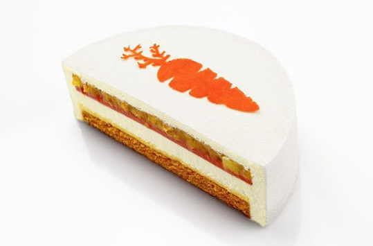 В состав торта входит влажный морковный кекс, нежное кремю со специями, дарящее тонкое послевкусие шафрана с гвоздикой, конфи из манго и моркови, манговое компоте, которое сложно удержаться и не съесть отдельно от торта, и пористый мусс на основе творожного сыра. В качестве декора выступает морковный чипс.