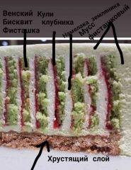 Хрустящее дно, бисквит венский , Кули клубника, намелака клубничная, мусс фисташковый