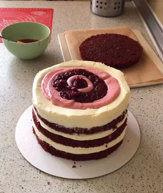 Внутри красного бархата клубничный ганаш, конфитюр и сырный крем.