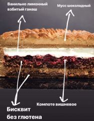 Шоко. бисквит, компоте вишня, взбитый ванильный ганаш, мусс шоколадный