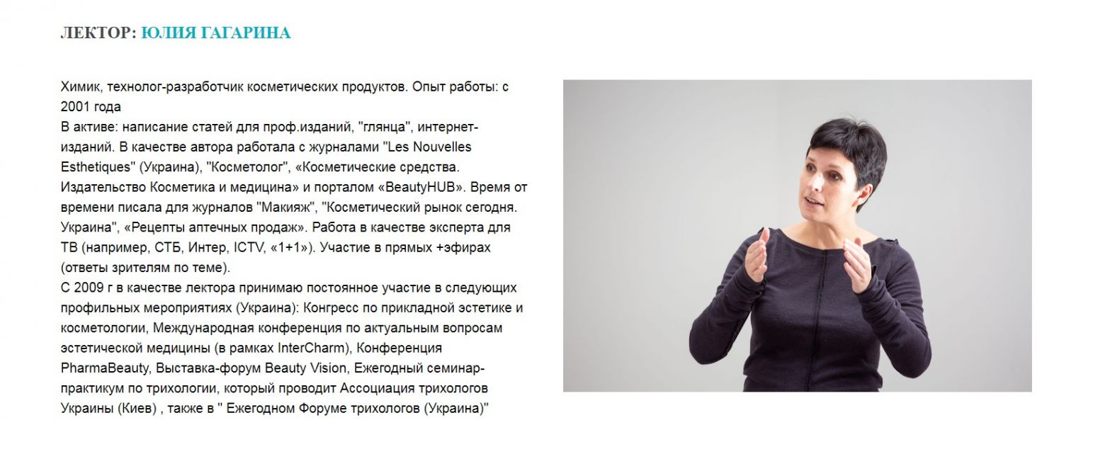 Вебинар проводит известный лектор, спикер локальных и международных конференций, разработчик косметики и химик-технолог Юлия Гагарина.