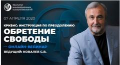 Кризисная ситуация, возникшая в результате пандемии коронавируса, уже изменила всех, все и вся далеко не лучшим способом. Однако, это пока только лишь «цветочки»: «ягодки» тотального кризиса – «идеального шторма», в котором почти полностью будут разрушены привычные условия и обстоятельства жизни мира и людей, — еще впереди. Так вот, именно для того, чтобы вы смогли уцелеть в этом кризисе Институт инновационных психотехнологий предлагает вашему вниманию цикл лекториев-вебинаров С.В. КОВАЛЕВА: «Кризис: инструкция по преодолению» посвященный обучению слушателей (в ходе непосредственной работы с самим собой) новейшим моделям и психотехнологиям превращения жизненных крушений в ситуацию обретения новых возможностей для обеспечения благополучия, эффективности, счастливости и смысла жизни.