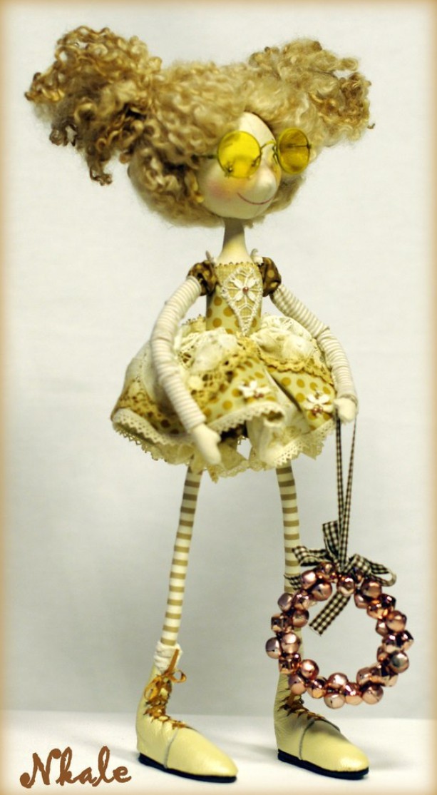 Золотая Стрекоза -текстильная каркасная кукла-тонконожка, рост 55 см, хорошо устойчиво самостоятельно стоит. на своих длинных тоненьких ножках, с пышной прической из овечьих локонов