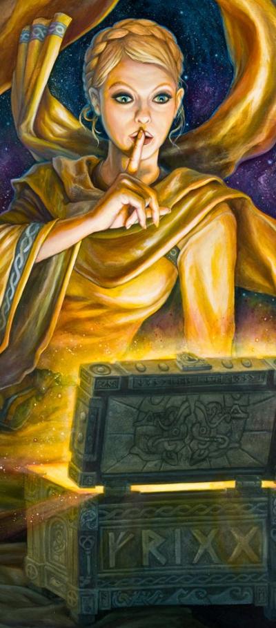 Фригг - богиня брака, любви, семейного очага. У Фригг есть ларец, который обладает свойством увеличения качества домовитости и притяжения денег в семью.