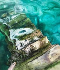 • Используем эффекты грануляции для ржавчины и старых фактур, яркость синих пигментов для воды и для деталей, учимся передавать прозрачность морского дна.