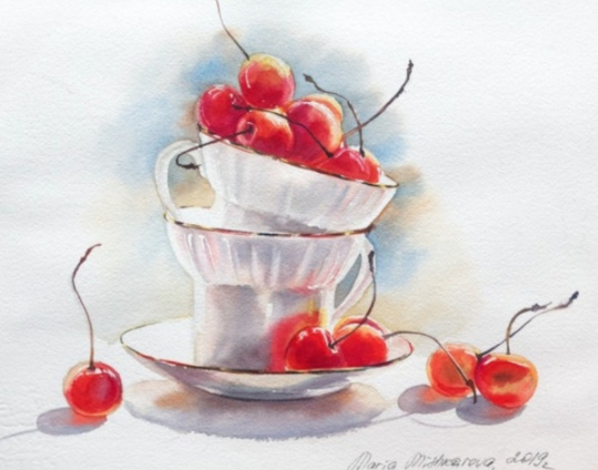 Этот урок посвящен двум темам – ягоды черешни и фарфор. Мария выполнит работу в быстрой этюдной манере в один слой. Вы узнаете как использовать маскирующую жидкость, работать быстро, подбирать яркие цвета, сохранить блики и свежесть работы.