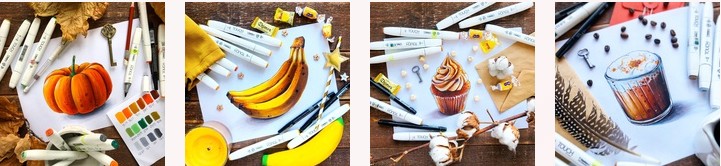 Начнём с основ и постепенно будем продвигаться к более сложным темам: на вводном уроке изучим самые основные азы, далее идёт урок «Банан», где мы научимся создавать объём и прорабатывать фактуру. На третьем уроке «Тыква» мы берём уже более сложную форму для создания объёма. На четвертом уроке рисуем капкейк. Подбираем к нему цвета, разбираемся со сложными тенями и объемами, создаём разную фактуру. На последнем уроке рисуем кофе: разбираем блики на стекле и то, как маркерами создать прозрачный объект. Разбираем чем отличаются жесткие блики на стекле и мягкие на кофейной пенке. Ну и, конечно, на каждом уроке учимся создавать объём, не забывая о падающих тенях.