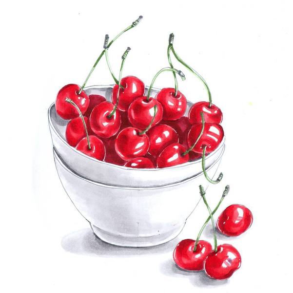 Давайте нарисуем эту спелую красную черешню в белой чашечке!