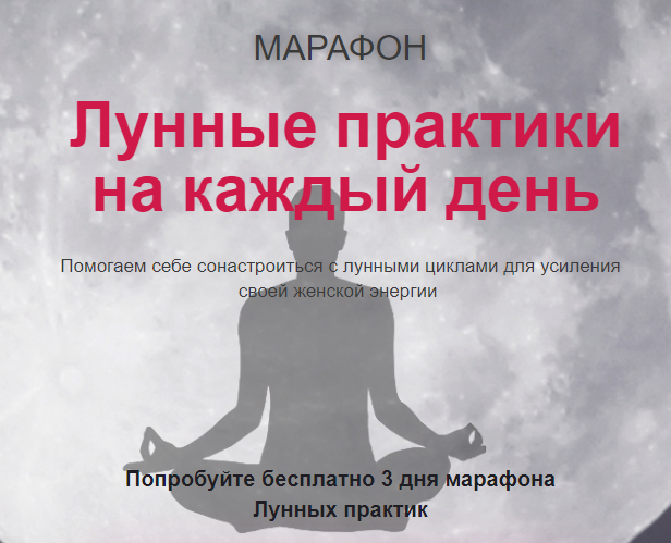 На этом марафоне Татьяны Писаревой вы познакомитесь с лунными практиками на каждый день, которые помогут вам синхронизироваться с Луной и настроиться на ее ритмы. Это особые ритуалы усиления своей внутренней силы, известные далеко не многим. Для прохождения марафона вам будет предоставлен актуальный лунный календарь. Материалы уроков содержат общую информацию, рекомендации, практики, медитации, советы по питанию и много другой полезной информации на каждый лунный день.
