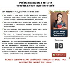 М.Минакова: 'Эта тема победила в конкурсе тем вебинаров, причем с большим отрывом. Вывод очевиден - это действительно важная тема для нас, практикующих психологов. Потому что проблемы с принятием себя - это ядро самых частых клиентских проблем. В том числе - проблем с самооценкой, проблем в созависимых отношениях, проблем с лишним весом...Научите клиента принимать и любить себя - и работа с другими темами сразу продвинется. Увидите'.