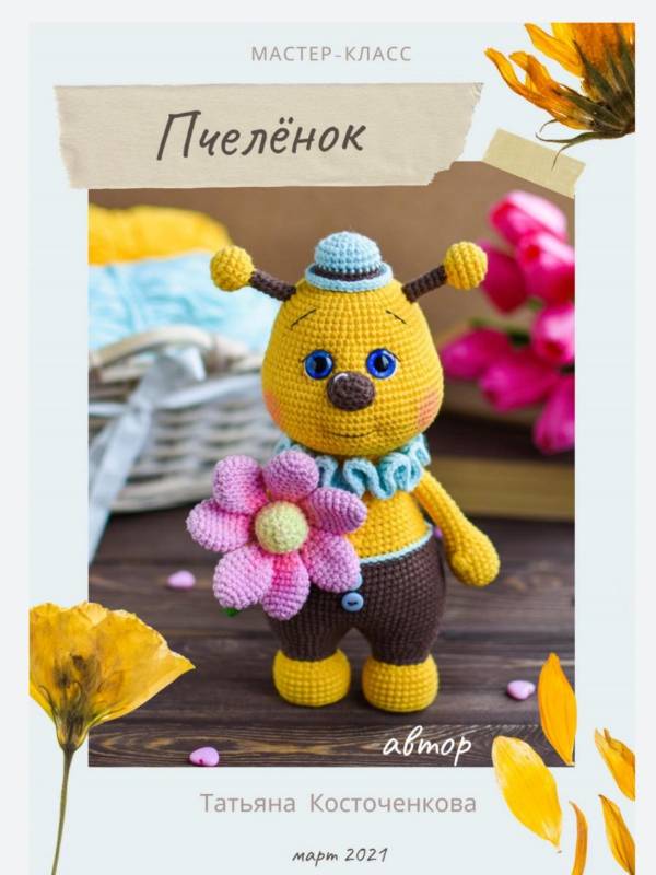 - состоит из 20 страниц пошагового описания вязания, оформления и сборки пчеленыша и цветочка