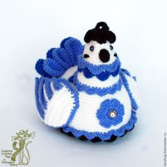 Мастер-класс на 23 листах содержит пошаговое описание работы с 80 фотографиями и схемой. В МК приведено описание вязания курочки в расцветке Гжель.