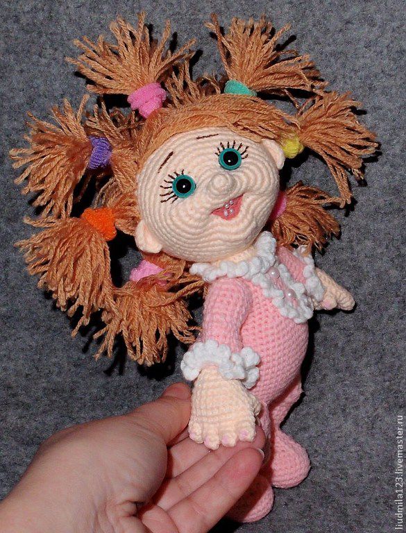 Ручки, ножки и голова крепятся в процессе вязания с помощью пластиковых суставов (шплинтов), поэтому подвижны. Глаза винтовые, реснички, бровки, ногти прорисованы.