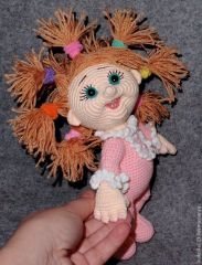 Кукла получается весёлая, жизнерадостная, сверкает зубками (бисеринки). Подойдет для детей любого возраста, т.к. не имеет хрупких деталей.