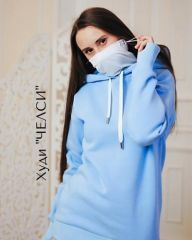 Шьём худи из тёплого футера 3-х нитки. Костюм на фото сшит из футера с начёсом в цвете «небо». Очень чистый и приятный оттенок.