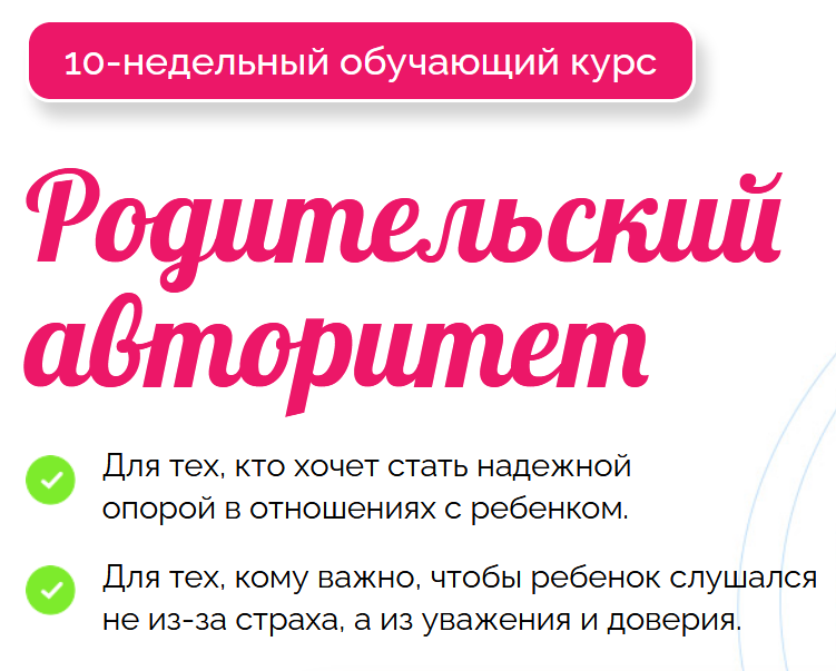 На 10-недельном курсе “Родительский авторитет”, мы рассказываем родителям, как вернуть семейную иерархию в естественное положение с помощью уникальной авторской разработки
