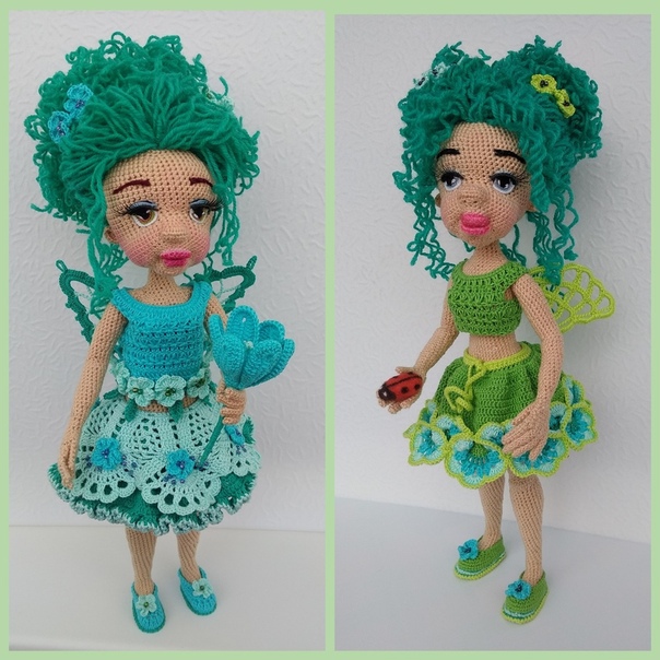 В мк будет одежда от обеих куколок ( две юбочки, два вида туфелек, два вида крылышек, ажурные трусики, кофточка и цветочки), 110 фотографий, 15 схем.
