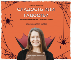 Галина Иевлева приглашает вас на вебинар «Сладость или гадость?» в самый необычный день года, чтобы заглянуть на свою темную сторону. Прогуляться туда, где вы давно похоронили свои мечты и тайные желания. Не бойтесь оказаться на этом кладбище в одиночку, мы пойдем туда вместе за ручку — в лучших традициях американских фильмов. Вдруг именно там скрыты ответы на главные вопросы, на которые вы не смогли найти ответы: