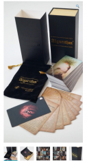Особенности колоды: Премиальная колода в подарочной упаковке. Высокопрочная коробка выдержана в строгом, классическом черно-золотом цвете. По черному фону выполнено объемное тиснение фольгой «матовое золото». Внутреннее отсеки коробки также выполнены в цвете «матовое золото». Для удобства извлечения колоды из коробки предусмотрена специальная лента. Коробка состоит из двух отсеков. В первом находятся карты и инструкция, во втором размещен свернутый бархатный мешочек. Дизайн инструкции выполнен в виде карт с тем же размером 12 х 7 см. соединенных в верхнем углу специальным винтом. Инструкция написана на русском и английском языках. Чтобы колода карт служила максимально долго, сверху на коробку одевается дополнительный рукав черного цвета из плотного картона.