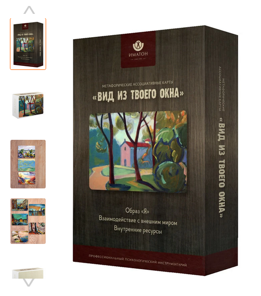 Метафорические карты «Вид из твоего окна» составлен из фотокопий 59 пейзажей, выполненных художником арт-терапевтом Викторий Ярославовой и набора из 43 карт-словосочетаний, используемых для достройки метафоры.