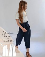 Детские брюки-кюлоты, на поясе, с защипами спереди, на резинке по талии сзади, с карманами в шве. Брюки имеют расклешение книзу. Застегиваются брюки на застежку – молнию. Длина брюк корректируется, средняя длина - до уровня середины икры. Возможно удлинить брюки или укоротить до длины шорт. Декоративный пояс завязывается на талии.