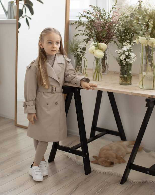 Двубортный детский тренчкот с воротником пиджачного типа. Объем оверсайз на 2 роста. Застежка на пуговицы.