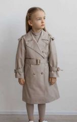 Двубортный детский тренчкот с воротником пиджачного типа. Объем оверсайз на 2 роста. Застежка на пуговицы.