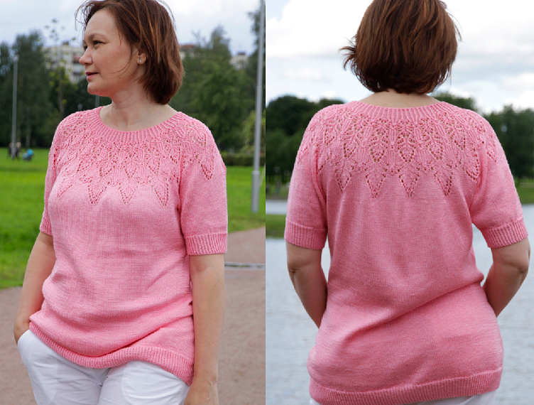 Детали корпуса и рукавов выполнены лицевой гладью по кругу в направлении снизу вверх. Росток выполнен между корпусом и кокеткой лицевой гладью. Круглая кокетка выполнена ажурным узором. Вырез горловины, низ изделия и рукавов выполнены резинкой 1х1 из скрещенных петель.