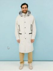 Плащ-дождевик свободного объема, прямого силуэта длиной ниже линии колен, без подкладки. Перед с центральной бортовой застежкой на кнопки. На деталях переда по два прорезных кармана на молнии верхний расположен вертикально, нижний горизонтально. Спинка с горизонтальной кокеткой и средним швом, по боковым швам имеются разрезы. Рукав рубашечный, низ обработан притачной манжетой с патой и кнопками для регулирования объема, по линии притачивания манжеты заложены две односторонние складки. Капюшон втачан в горловину вместе с воротником-стойкой. Капюшон умеренного объема, с отрезной центральной частью, в переднем срезе капюшона обработана кулиска с плавной регулировкой прилегания при помощи круглого шнура. Для фиксации шнура установлены по две люверсы справа и слева и стопоры с двумя отверстиями.