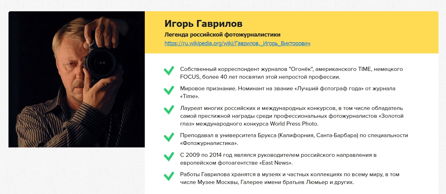 Уникальный курс от одного из самый известных и признанных российских фотографов Игоря Гаврилова — фотожурналиста, которого знают и уважают в профессиональной среде во всем мире. Если вы хотите снимать на уровне лучших мировых фотографов, учитесь у лучших, таких как Игорь.