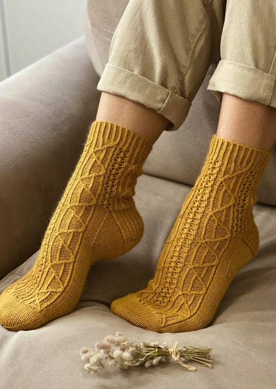 Овечья шерсть (например, классическая Regia, Gruendl Hot Socks), шерсть+як (Regia Premium Merino yak), Katia Camel, Andes, Austermann Step, Lana Grossa Meilenweit. Плотность 32 петли - 10 см. Спицы 2-3 мм;