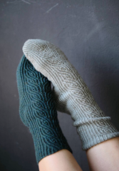 Отличительная особенность этой модели - не только завораживающие переплетения узора, но и пятка методом Гердины Кроуфорд-Стронг, которая образует цельную конструкцию с клином стопы и не требует нелюбимого многими подъема петель из кромочных.