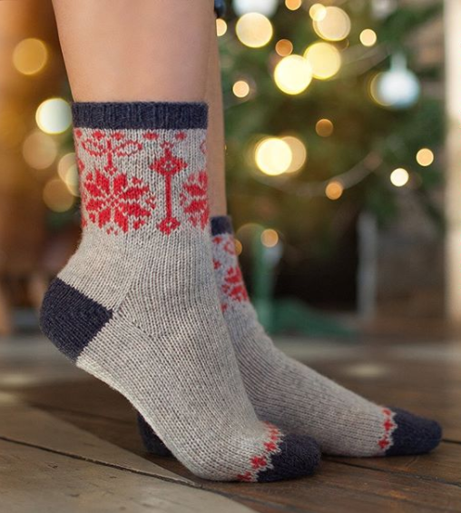 ?Носки вяжутся от мыска, пятка бумеранг выделена контрастным цветом, клин подъема имеется. Жаккардовый узор на паголенке.