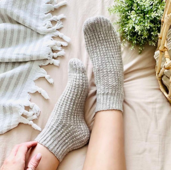 Носок вяжется поперек, начиная сбоку, одним полотном, в виде прямоугольника, зауженного с одной стороны (мысок). В процессе будем вывязывать пятку, без отрыва нити. В конце соединяем начальный и кромочный ряды при помощи крючка.