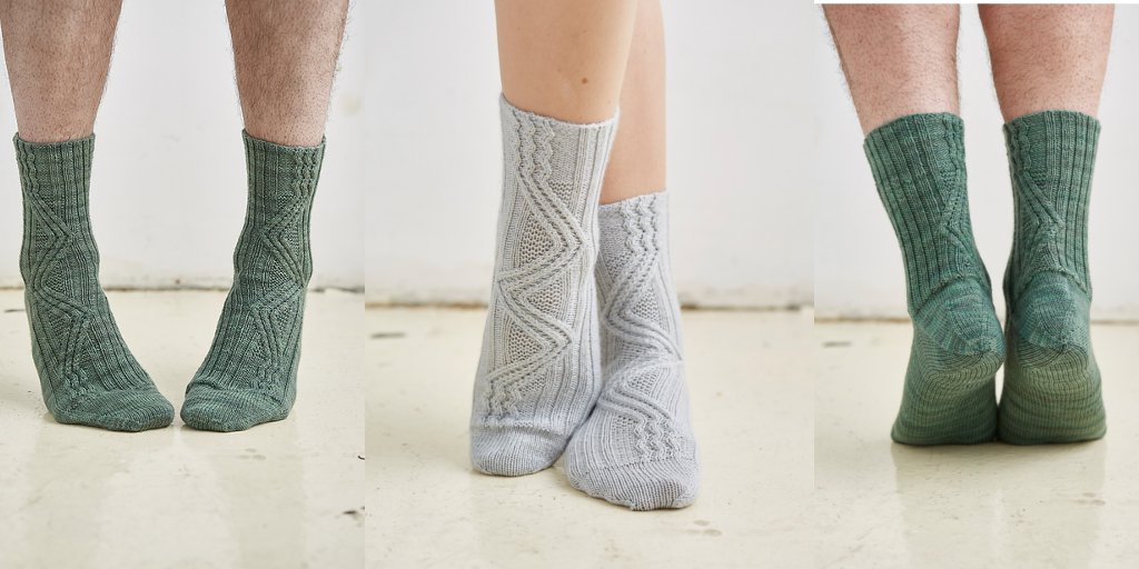 Носки с косами в виде зигзага вяжем по кругу спицами от манжеты к пальчикам, с круглой пяткой, что облегчает ее замену в процессе изнашивания.
