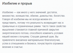 Изобилие — как много у него значений: достаток, множество, излишество, обилие, довольство, богатство. Говоря об изобилии мы не всегда можем его представить, потому что реальность возвращает нас в привычные и ограниченные рамки. Часто такое свойство мышления становится главной причиной закрытия энергетического потока, способного изменить условия нашей жизни к лучшему. Слушая данный шум, Вы привлечете внезапное материальное благополучие, успех в отношениях и бизнесе, почувствуете огромное везение и счастье.