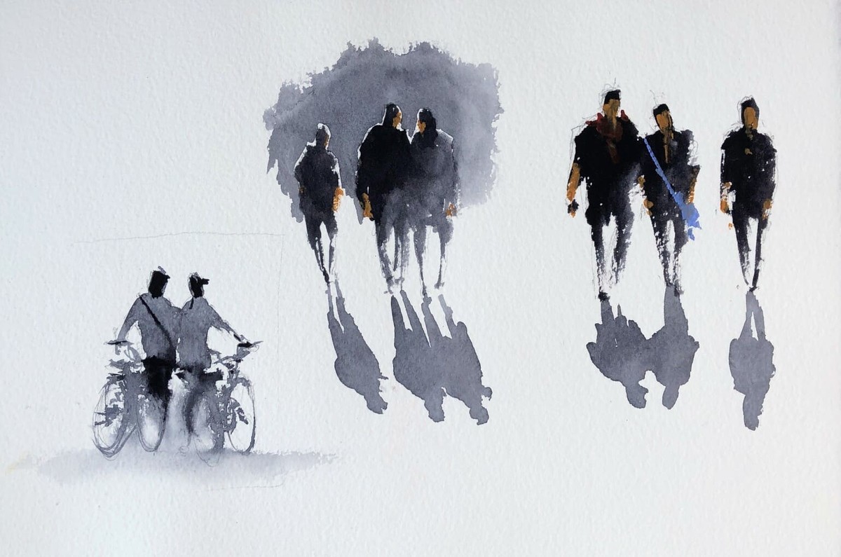 Добавим живости и деталей, изобразив прохожих, и правильно расставив цветовые акценты.