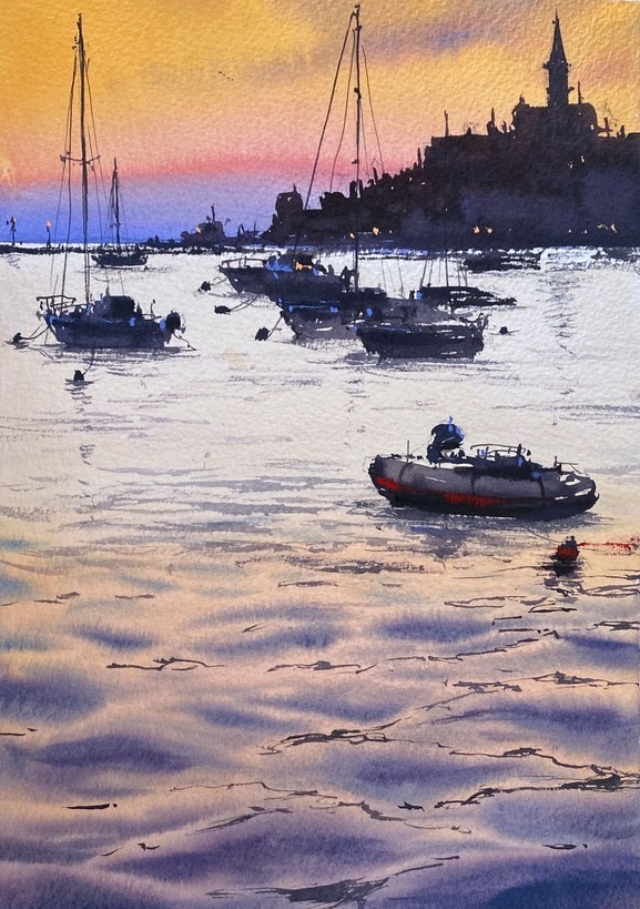 - Передаем закатный свет и используем нетипичные смешения цветов для воды.