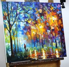 Его картины напоминают зачарованный калейдоскоп: яркие, пёстрые, выразительные и захватывающие воображение. Каждый квадратный мазок приковывает к себе взгляд и вызывает больший интерес, чем радужный хвост павлина. Небо на произведениях Леонида Афремова (Leonid Afremov) ? пронзительно синее, города – сказочные и очаровательные, а фигуры людей – загадочные. Картины этого художника невозможно спутать с любыми другими, настолько они выразительны и оригинальны. Автор пишет их не кисточками, а мастихином ? специальным мастерком для нанесения густой масляной краски на холст. Эта техника делает работы рельефными и очень яркими. Каждый сантиметр картин будто светится.