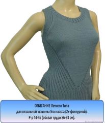 В файле формата pdf представлено пошаговое описание вязания Летнего Топа с фотографиями и схемами. Расчет сделан для вязания на вязальной машине 5го класса (2х-фонтурной) для росс. размера 44-46 (обхват груди 86-93 см).
