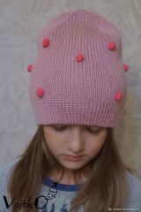 Эффект спиц и лаконичность в украшении - декор в виде 7 горошин (драже), акцент сделан на узор и форму шапки.