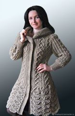 Описание вязания пальто на спицах содержит схемы и описания узоров, схемы выкроек, описание вязания отдельных деталей изделия с расчетом количества петель и рядов для указанного заказчиком размера, описание процесса сборки, фото некоторых фрагментов изделия.