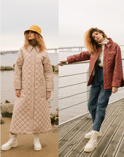 Пальто свободного объема, трапециевидного силуэта, длиной ниже середины икры, из многослойного стеганого курточного материала (курточная ткань и утеплитель - нетканое объемное полотно). Перед с притачными планками с центральной застежкой на 7 кнопок; с боковыми накладными карманами на уровне бедер, которые уходят в боковой шов. Спинка цельнокроеная, с горизонтальной кокеткой. Рукава рубашечные, длинные, втачные, одношовные, пата по низу рукава одним концом входит в нижний шов, другим крепится к рукаву на нитяной столбик. Воротник отложной с отрезной стойкой. Изделие со спущенным плечом на 5,5 см относительно плечевой точки. Накладные карманы, воротник, планки, паты рукава из курточной ткани-компаньона в тон основного материала. Изделие на подкладке.
