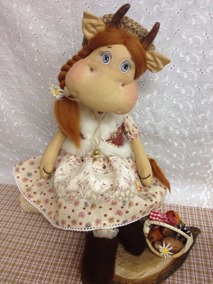 Приглашаем Вас сшить под руководством мастера очаровательную коровушку по имени Зорька. Ее рост 45 см! Кукла сшита из хлопка с использованием техники грунтованный текстиль. Наряд многослойный с кружевом, прическа сделана из шерсти, рога из глины.
